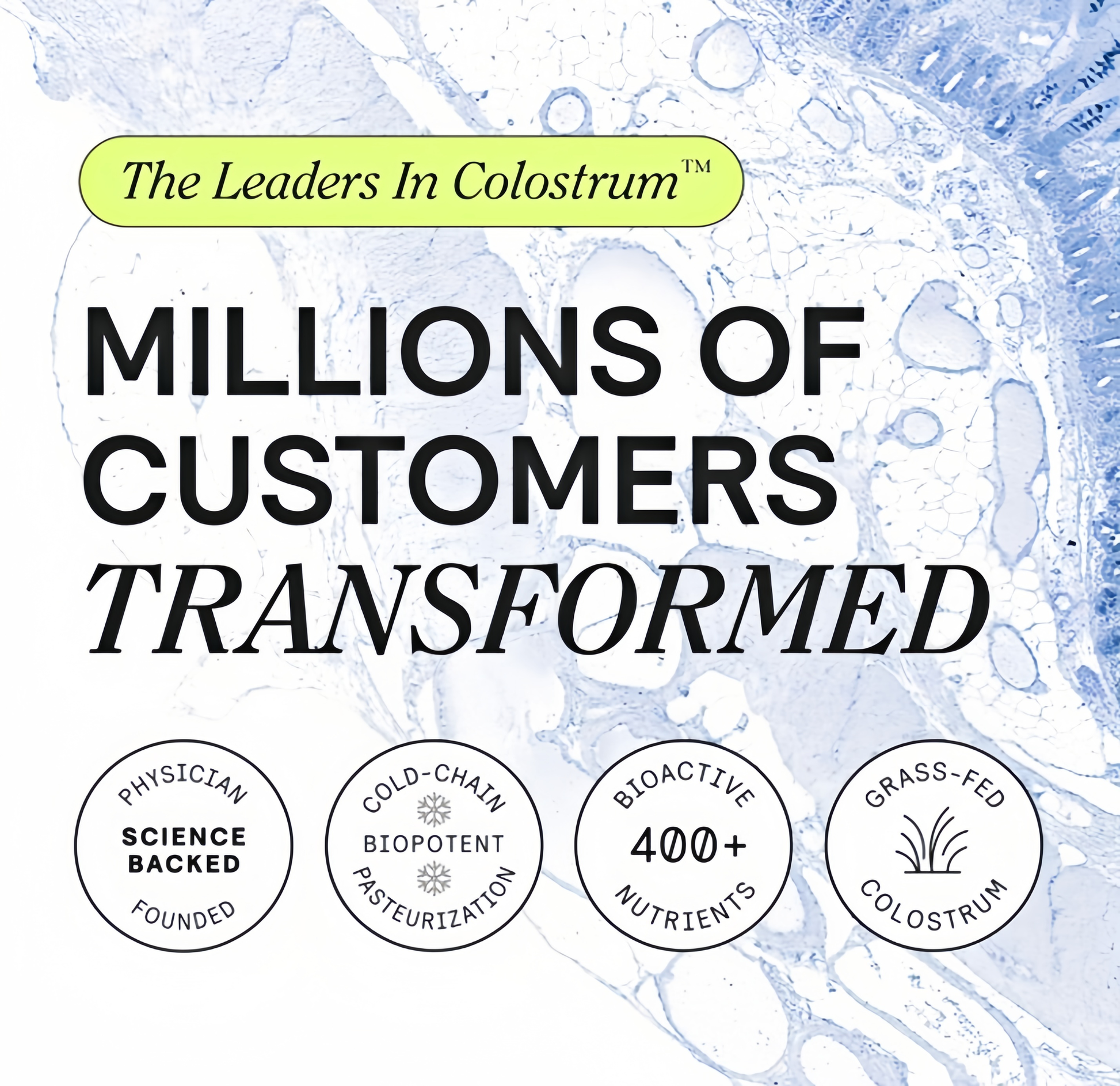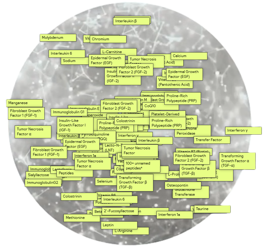 When you take colostrum you fuel your body with potent prebiotics that support your microbiome, a host of peptides and antibodies that strengthen your immune barriers, and dozens of antioxidants and bioactive molecules that support cellular pathways throughout your body, for synergistic revival of your whole body health.